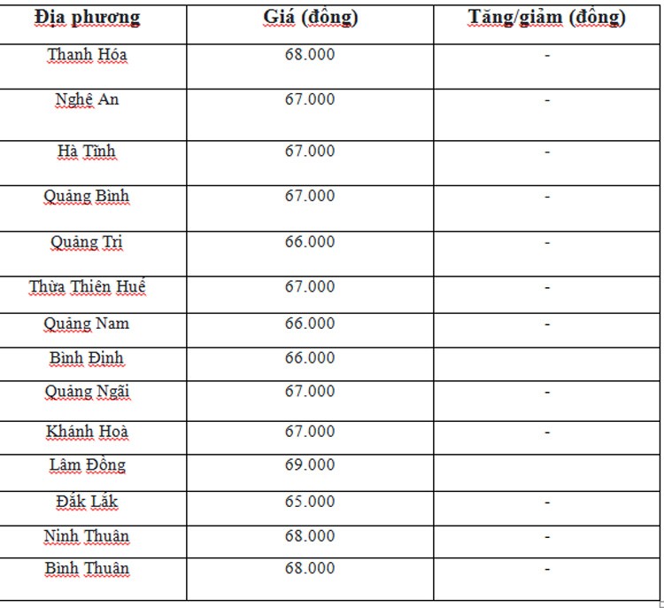 Các địa phương còn lại trong khu vực cùng ghi nhận ở mức 66.000 - 67.000 đồng/kg.