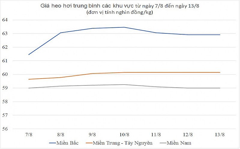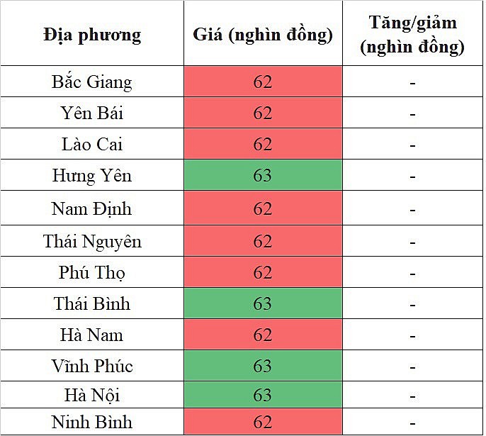 Theo đó, mức giá cao nhất khu vực 63.000 đồng/kg được ghi nhận tại Hưng Yên, Thái Bình, Vĩnh Phúc, Hà Nội, Tuyên Quang.