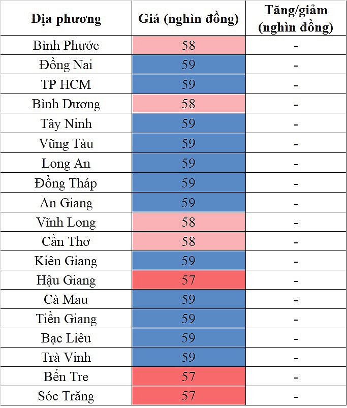 Theo đó, mức giá thấp nhất khu vực 57.000 đồng/kg được ghi nhận tại Bến Tre, Sóc Trăng và Hậu Giang.