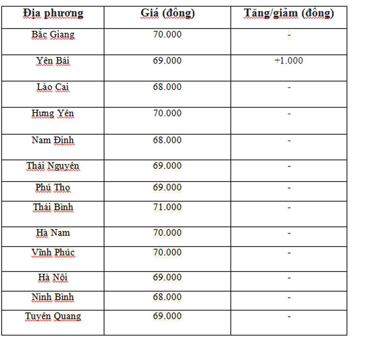 Ở chiều ngược lại, mức giá cao nhất khu vực 71.000 đồng/kg được ghi nhận tại Thái Bình. Các địa phương khác trong khu vực ghi nhận mức giá 70.000 đồng/kg.