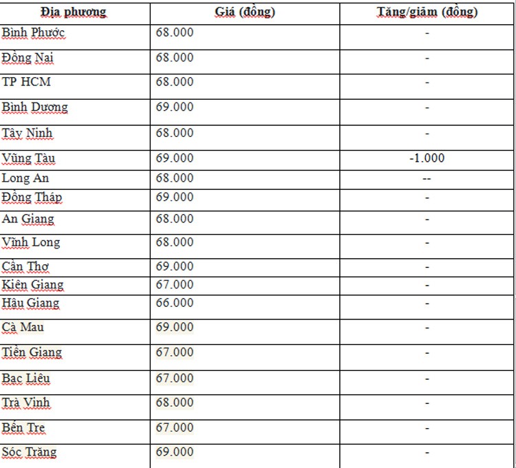 Sau khi giảm một giá 1.000 đồng/kg, thương lái tại tỉnh Vũng Tàu cùng thu kg mua heo hơi tại mốc 68.000 đồng/kg ngang bằng với Tây Ninh, Bình Phước, Đồng Nai, TP HCM, Vũng Tàu, An Giang, Vĩnh Long, Cần Thơ, Trà Vinh.