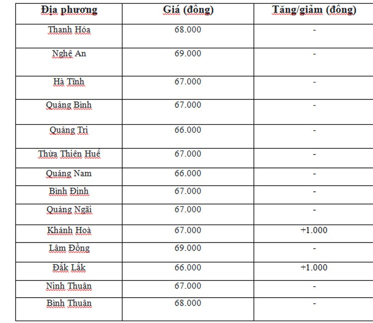 Các địa phương khác trong khu vực ghi nhận mức giá 67.000 đồng/kg.