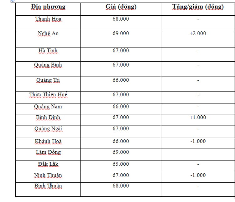 Các địa phương khác không ghi nhận sự biến động về giá, trong đó, mức giá cao nhất khu vực 69.000 đồng/kg được ghi nhận tại Lâm Đồng, Nghệ An.