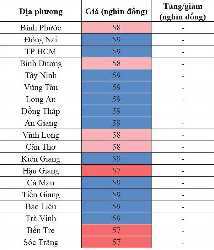 Ở chiều ngược lại, mức giá cao nhất khu vực 59.000 đồng/kg được ghi nhận tại Đồng Nai, TP. Hồ Chí Minh, Tây Ninh, Vũng Tàu, Long An, Đồng Tháp, An Giang, Kiên Giang, Cà Mau, Tiền Giang, Bạc Liêu, Trà Vinh.