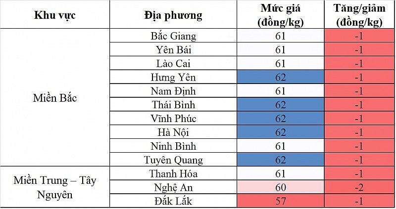 Các địa phương khác không ghi nhận sự biến động mới về giá và ghi nhận phổ biến ở mức 59.000 đồng/kg.