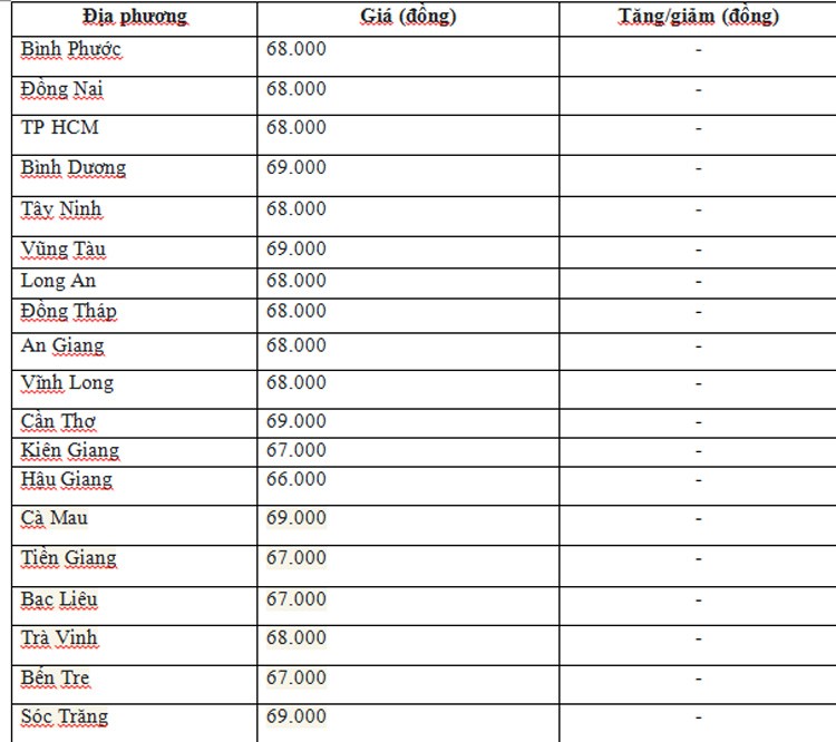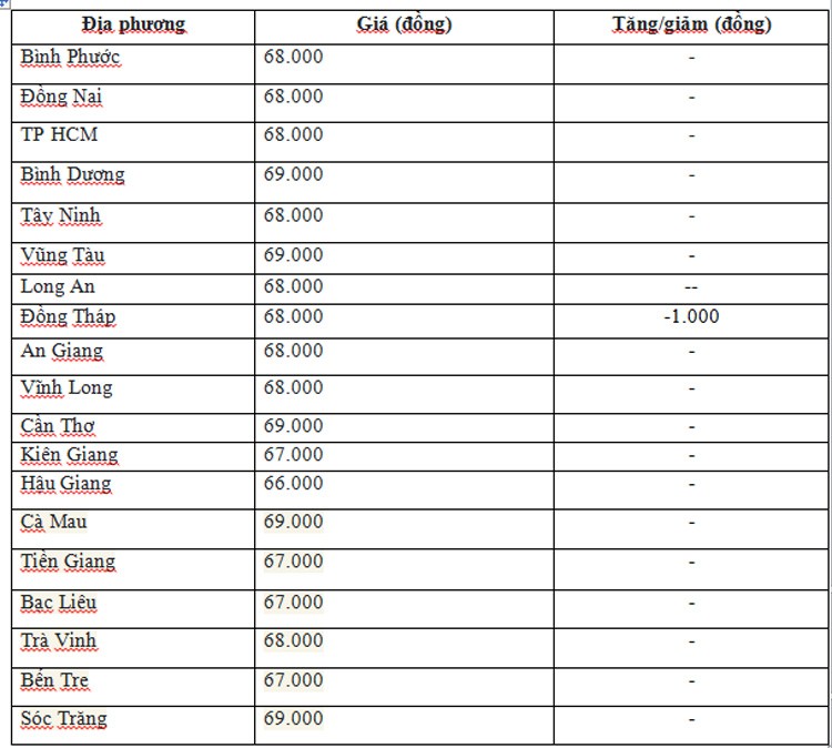 Theo đó, mức giá cao nhất khu vực 69.000 đồng/kg được ghi nhận tại Long An, Bình Dương, Cà Mau, Sóc Trăng.