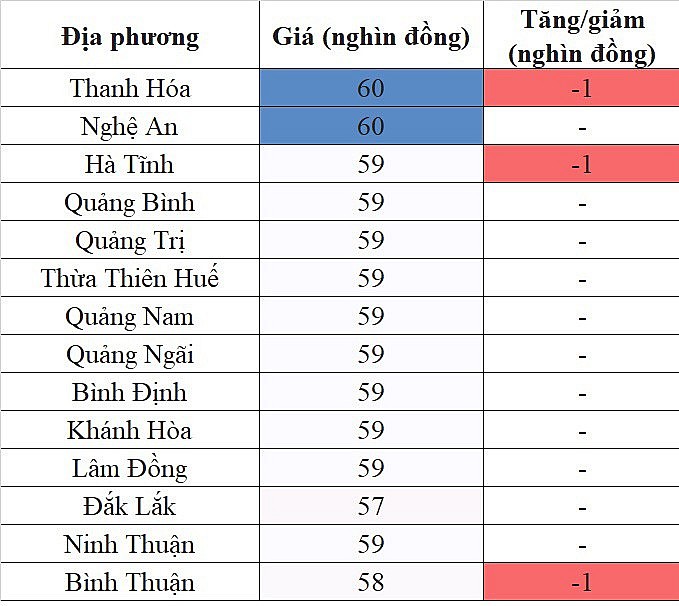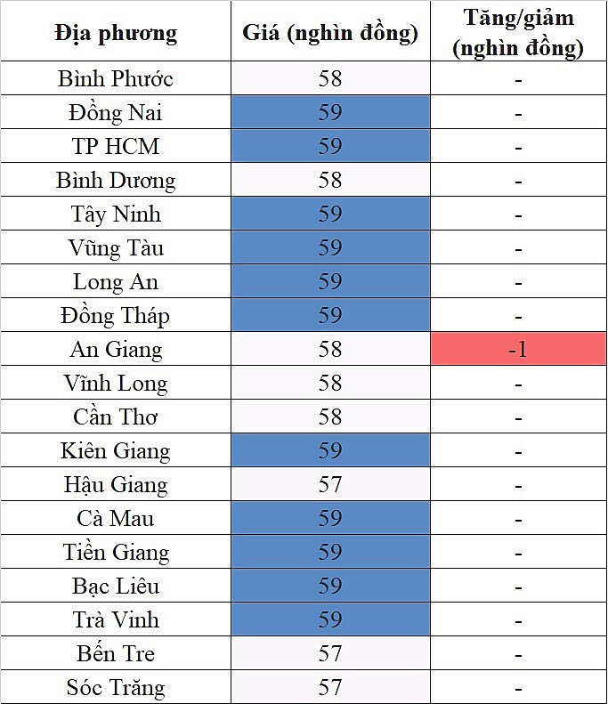 Theo đó, mức giá cao nhất khu vực 59.000 đồng/kg được ghi nhận tại Đồng Nai, TP. Hồ Chí Minh, Tây Ninh, Vũng Tàu, Long An, Đồng Tháp, An Giang, Kiên Giang, Cà Mau, Tiền Giang, Bạc Liêu, Trà Vinh.