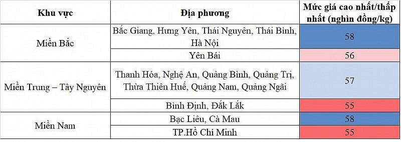 Theo đó, mức giá cao nhất khu vực 58.000 đồng/kg được ghi nhận tại Bắc Giang, Hưng Yên, Thái Nguyên, Thái Bình và Hà Nội.