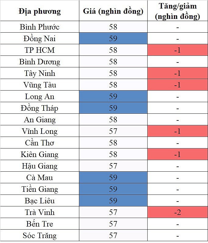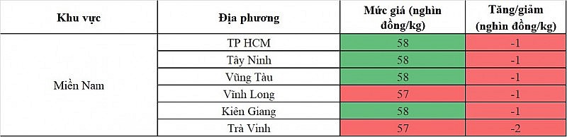 Tương tự, sau khi cùng giảm nhẹ 1.000 đồng/kg, heo hơi tại các tỉnh thành gồm TP. Hồ Chí Minh, Tây Ninh, Vũng Tàu và Kiên Giang xuống còn 58.000 đồng/kg.