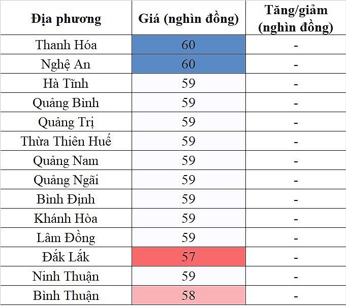Cụ thể, mức giá cao nhất khu vực 60.000 đồng/kg được ghi nhận tại Thanh Hóa và Nghệ An.