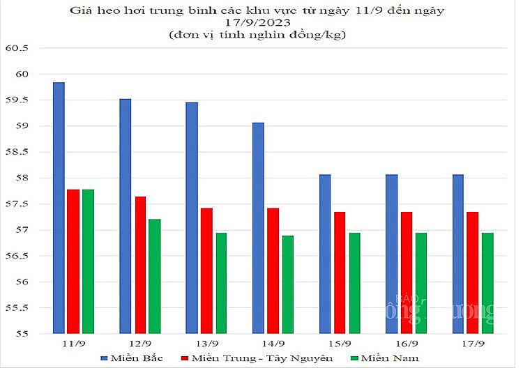 Tính chung, trong tuần qua (từ 11/9 đến 17/9/2023), giá heo hơi biến động theo xu hướng giảm trên diện rộng. Nhiều địa phương đã tuột mốc 60.000 đồng/kg. Ghi nhận ngày cuối tuần 17/9/2023, giá heo hơi trung bình tại khu vực miền Bắc đứng ở mức 57.070 đồng/kg; khu vực miền Trung – Tây Nguyên ở mức 57.350 đồng/kg; khu vực miền Bắc ở mức 56.940 đồng/kg. Sức mua trên thị trường khá thấp.