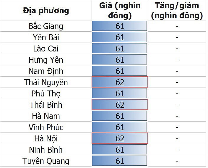Ở chiều ngược lại, mức giá cao nhất khu vực 62.000 đồng/kg được ghi nhận tại các địa phương bao gồm Thái Nguyên, Thái Bình và Hà Nội.