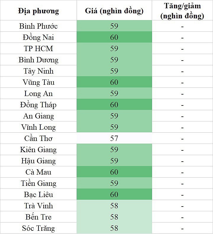 Ở chiều ngược lại, mức giá cao nhất khu vực 60.000 đồng/kg được ghi nhận tại một loạt các địa phương gồm Đồng Nai, Vũng Tàu, Đồng Tháp, Cà Mau, Bạc Liêu.