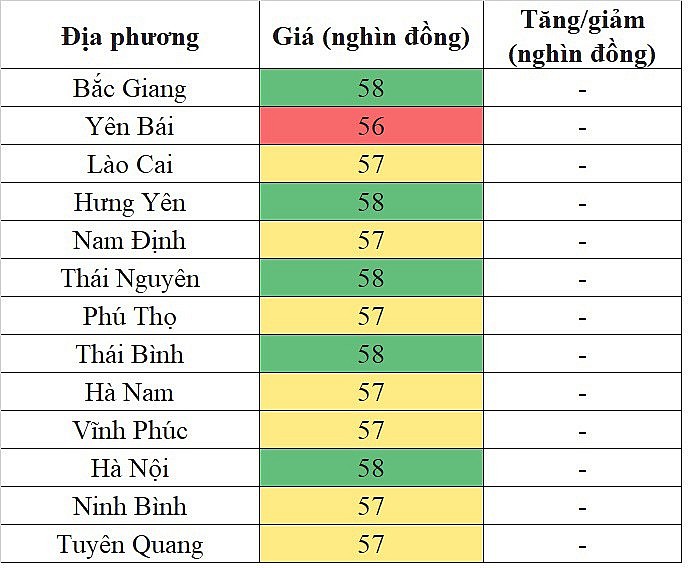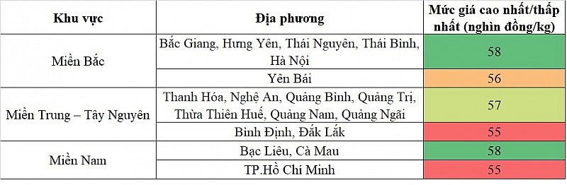 Theo đó, mức giá cao nhất khu vực 58.000 đồng/kg được ghi nhận tại Bắc Giang, Hưng Yên, Thái Nguyên, Thái Bình và Hà Nội.