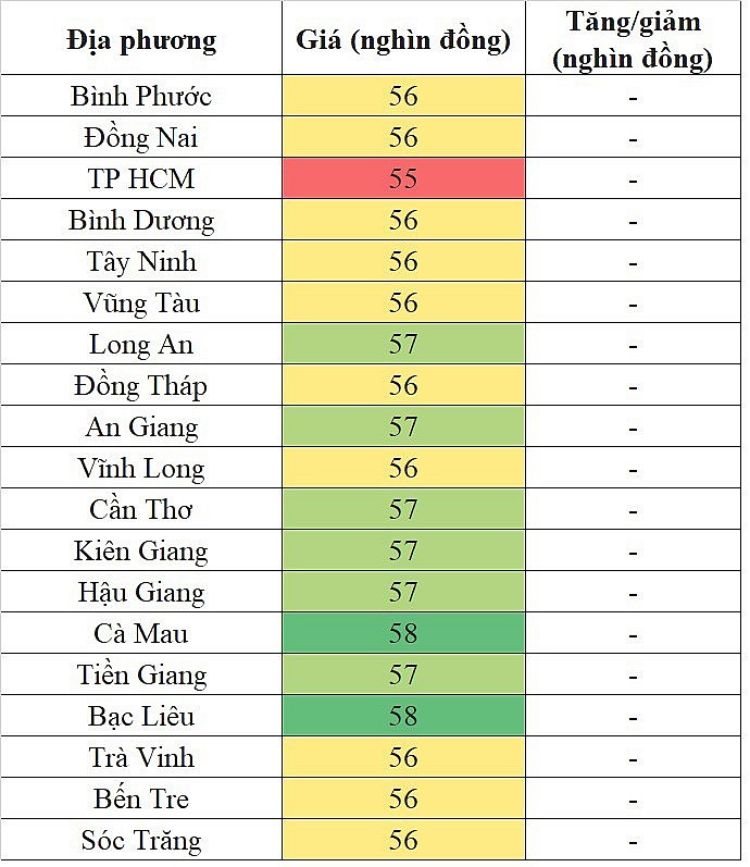 Các tỉnh thành còn lại có giá giao dịch ổn định trong khoảng 56.000 - 57.000 đồng/kg.