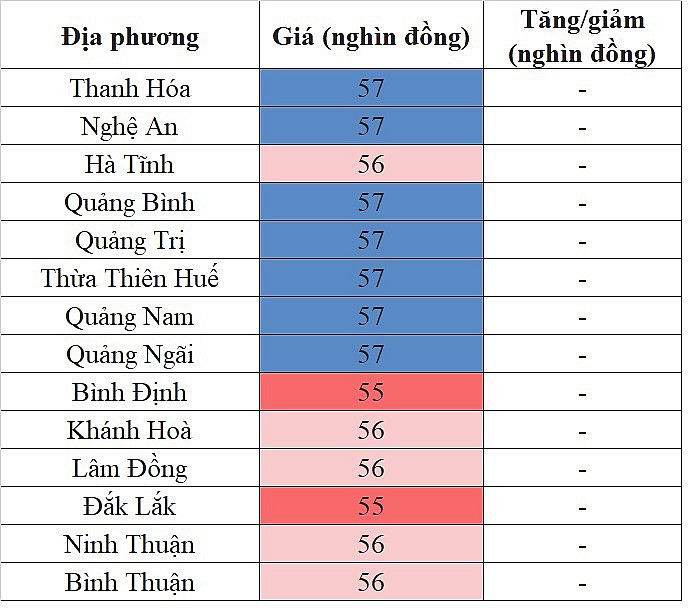 Theo đó, mức giá cao nhất khu vực 57.000 đồng/kg được ghi nhận tại Thanh Hóa, Nghệ An, Quảng Bình, Quảng Trị, Thừa Thiên Huế, Quảng Nam, Quảng Ngãi.