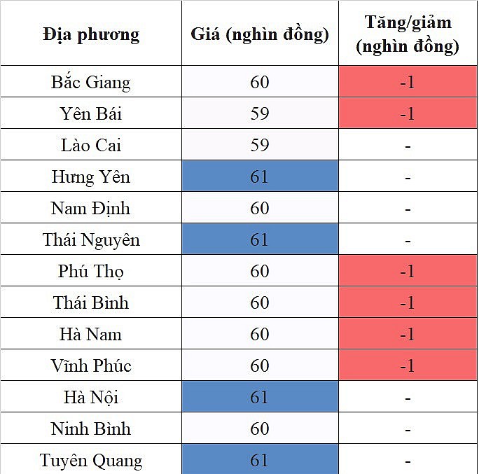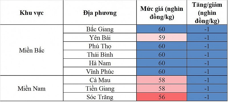 Các địa phương khác không ghi nhận sự biến động mới về giá, trong đó, mức giá cao nhất khu vực 61.000 đồng/kg được ghi nhận tại Hưng Yên, Thái Nguyên, Hà Nội, Tuyên Quang.