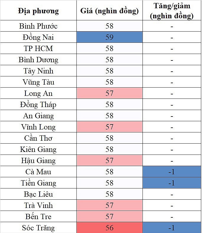 Các địa phương khác trong khu vực không ghi nhận sự biến động mới về giá, trong đó, mức giá cao nhất khu vực 59.000 đồng/kg được ghi nhận tại Đồng Nai.
