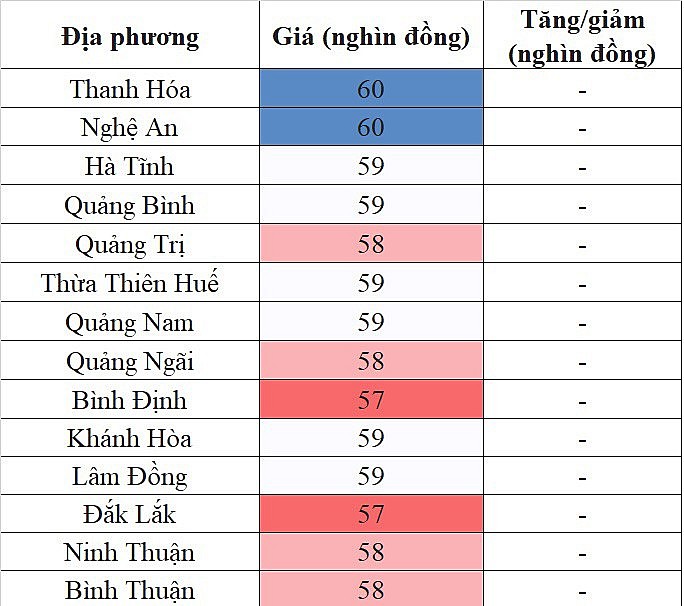 Ở chiều ngược lại, mức giá cao nhất khu vực 60.000 đồng/kg được ghi nhận tại Thanh Hóa, Nghệ An.