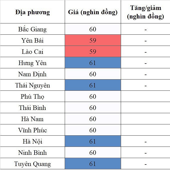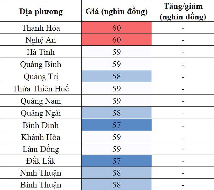 Ở chiều ngược lại, mức giá cao nhất khu vực 60.000 đồng/kg được ghi nhận tại Thanh Hóa, Nghệ An.