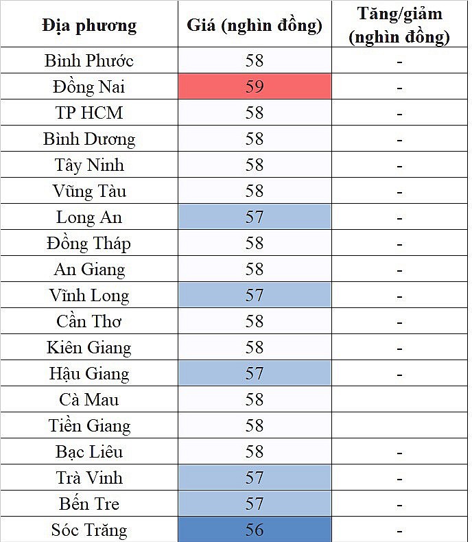 Mức giá cao nhất khu vực 59.000 đồng/kg được ghi nhận tại Đồng Nai.