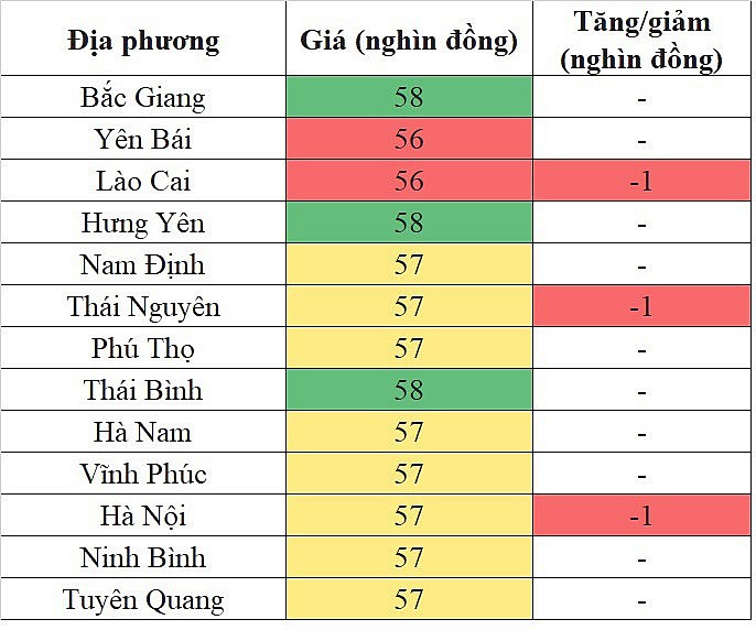 Các địa phương khác không ghi nhận sự điều chỉnh mới về giá, trong đó, mức giá cao nhất khu vực 58.000 đồng/kg được ghi nhận tại Bắc Giang, Hưng Yên, Thái Bình.