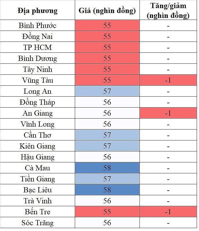 Các địa phương khác không ghi nhận biến động mới về giá, trong đó, mức giá cao nhất 58.000 đồng/kg được ghi nhận tại Cà Mau, Bạc Liêu.