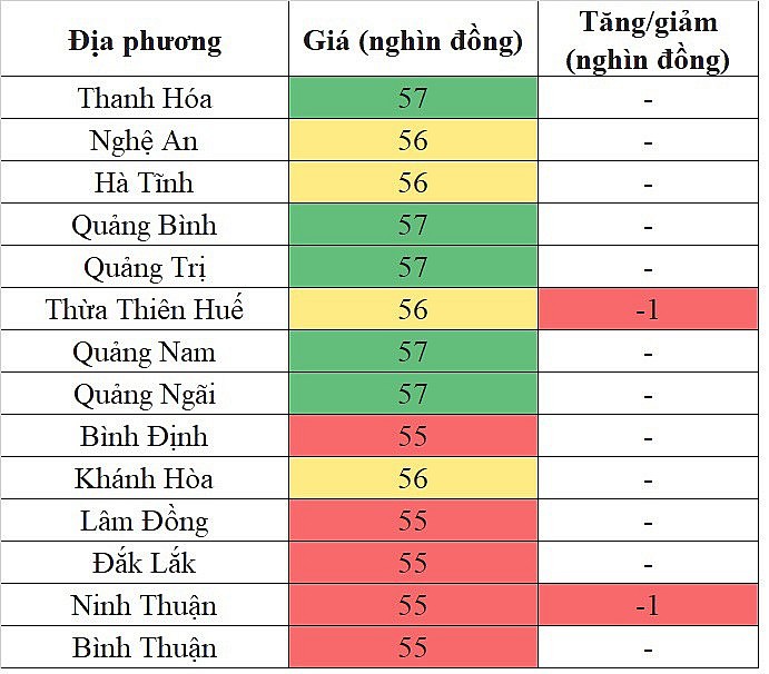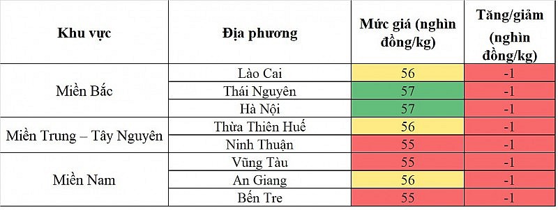 Các tỉnh thành khác trong khu vực không ghi nhận sự biến động mới về giá và duy trì ở mức 57.000 đồng/kg.