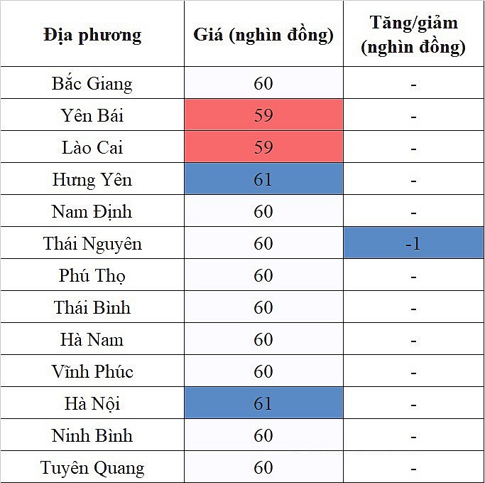 Các địa phương khác không ghi nhận sự biến động mới về giá, trong đó, Yên Bái, Lào Cai cùng ghi nhận mức giá thấp nhất khu vực 59.000 đồng/kg.