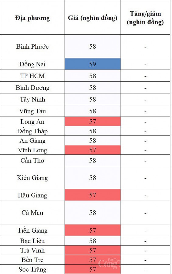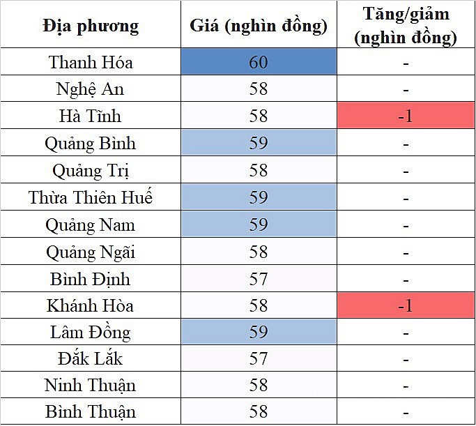 Ở chiều ngược lại, mức giá thấp nhất khu vực 57.000 đồng/kg được ghi nhận tại Long An,Vĩnh Long, Hậu Giang, Tiền Giang, Trà Vinh, Bến Tre, Sóc Trăng.
