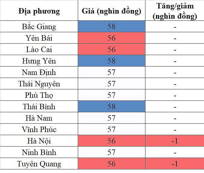 Các địa phương khác không ghi nhận sự biến động mới về giá, trong đó, mức giá cao nhất khu vực 58.000 đồng/kg được ghi nhận tại Bắc Giang, Hưng Yên, Thái Bình.