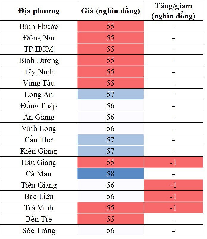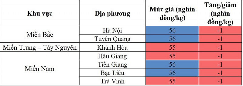 Các địa phương khác không ghi nhận biến động mới về giá, trong đó, mức giá cao nhất 58.000 đồng/kg được ghi nhận tại Cà Mau.
