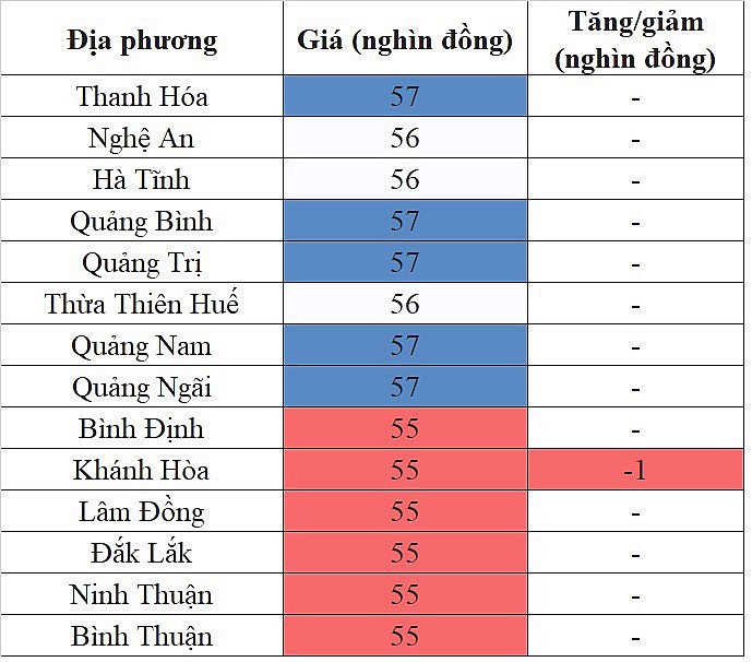 Các tỉnh thành khác trong khu vực duy trì ở mức 57.000 đồng/kg.