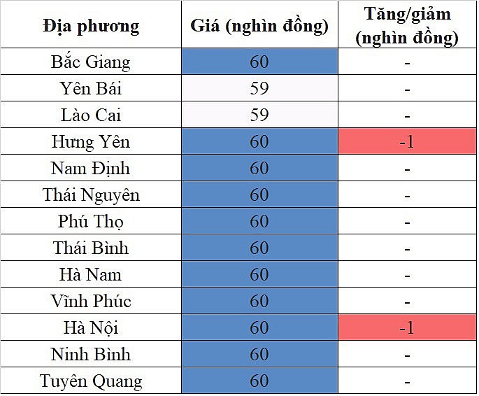 Các địa phương khác trong khu vực không ghi nhận sự biến động mới về giá, trong đó, mức giá thấp nhất khu vực 59.000 đồng/kg được ghi nhận tại hai tỉnh Yên Bái và Lào Cai.