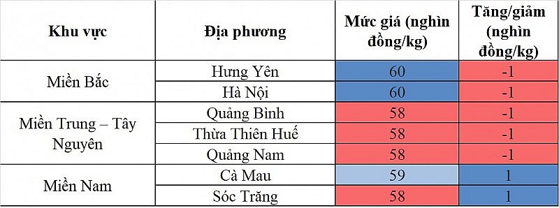 Các địa phương khác trong khu vực không ghi nhận sự biến động mới về giá, trong đó, mức giá thấp nhất khu vực 57.000 đồng/kg được ghi nhận tại Long An, Vĩnh Long, Hậu Giang, Tiền Giang, Trà Vinh, Bến Tre.