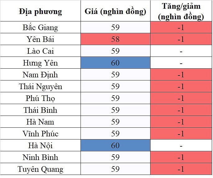 Ngoại trừ Lào Cai, Hưng Yên và Hà Nội có giá đi ngang trong ngày hôm nay và lần lượt đứng ở mức 59.000 đồng/kg, 60.000 đồng/kg và 60.000 đồng/kg.
