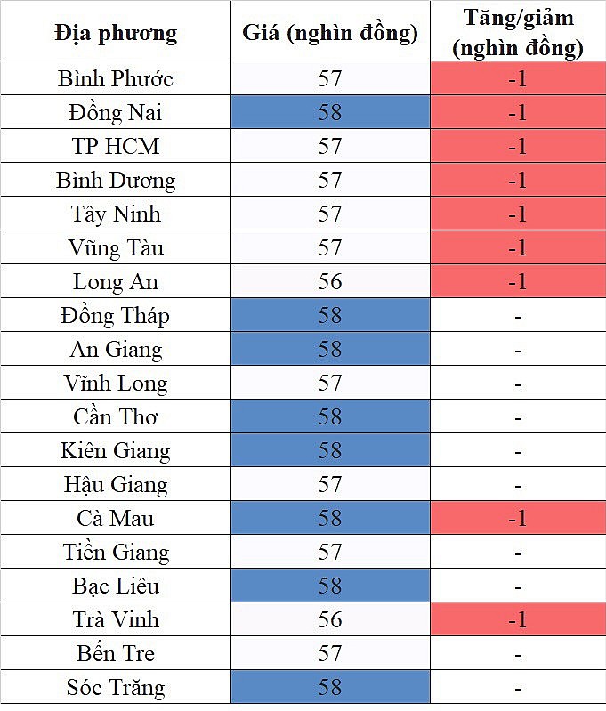 Theo đó, sau khi giảm 1.000 đồng/kg, hiện mức giá thấp nhất khu vực đang được ghi nhận tại hai tỉnh Long An và Trà Vinh là 56.000 đồng/kg.