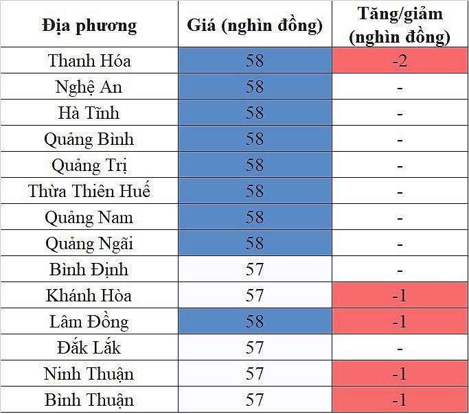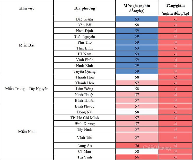 Các tỉnh, thành khác trong khu vực không ghi nhận sự biến động mới về giá và dao động trong khoảng 57.000 – 58.000 đồng/kg.