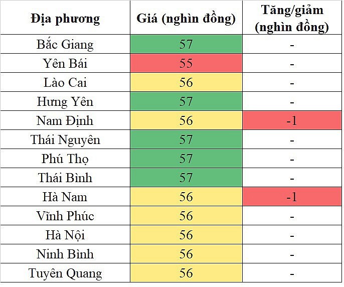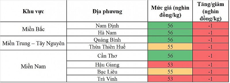 Ở chiều ngược lại, mức giá cao nhất khu vực 57.000 đồng/kg được ghi nhận tại Bắc Giang, Hưng Yên, Thái Nguyên, Phú Thọ, Thái Bình.