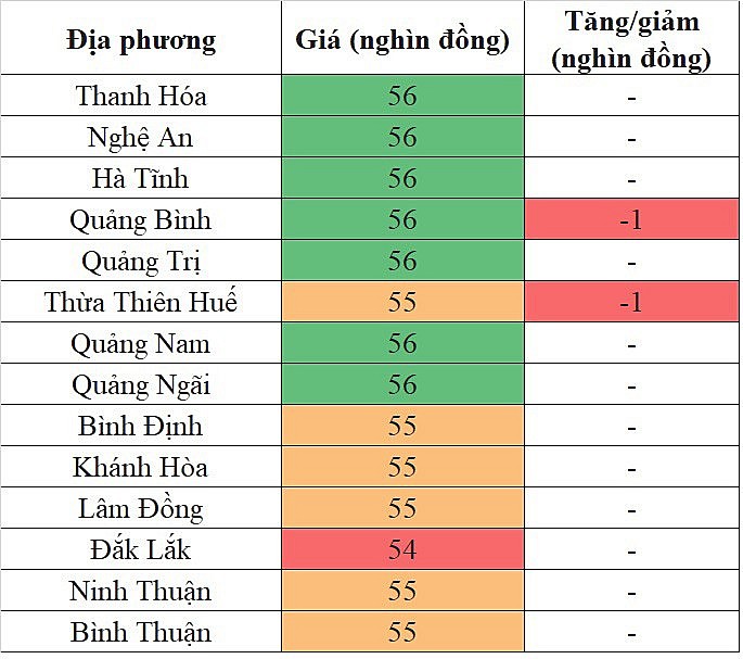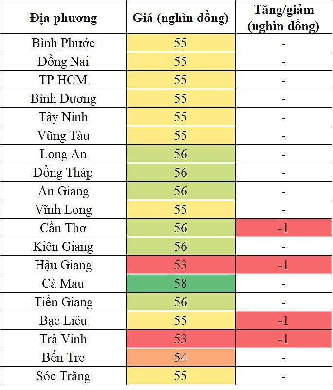 Các tỉnh thành còn lại trong khu vực không có thay đổi mới về giá so với ngày hôm qua.