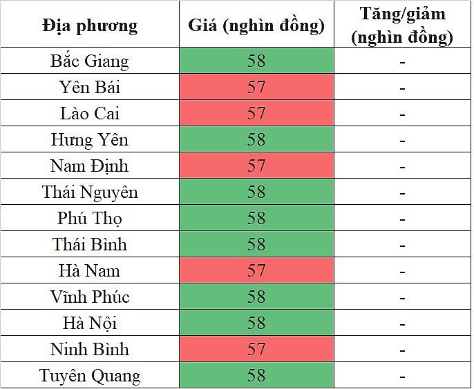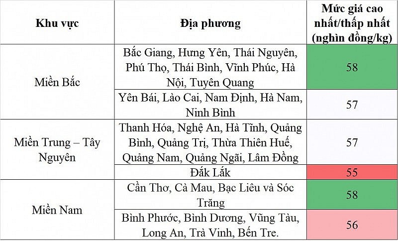 Ở chiều ngược lại, mức giá cao nhất khu vực 58.000 đồng/kg được ghi nhận tại Bắc Giang, Hưng Yên, Thái Nguyên, Phú Thọ, Thái Bình, Vĩnh Phúc, Hà Nội, Tuyên Quang.