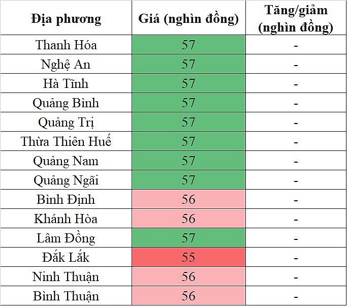 Theo đó, mức giá cao nhất khu vực 57.000 đồng/kg được ghi nhận tại Thanh Hóa, Nghệ An, Hà Tĩnh, Quảng Bình, Quảng Trị, Thừa Thiên Huế, Quảng Nam, Quảng Ngãi, Lâm Đồng.