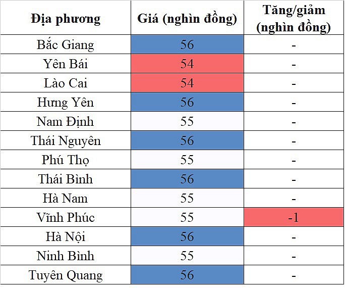 Ở chiều ngược lại, mức giá cao nhất khu vực 56.000 đồng/kg được ghi nhận tại Bắc Giang, Hưng Yên, Thái Nguyên, Thái Bình, Hà Nội, Tuyên Quang.