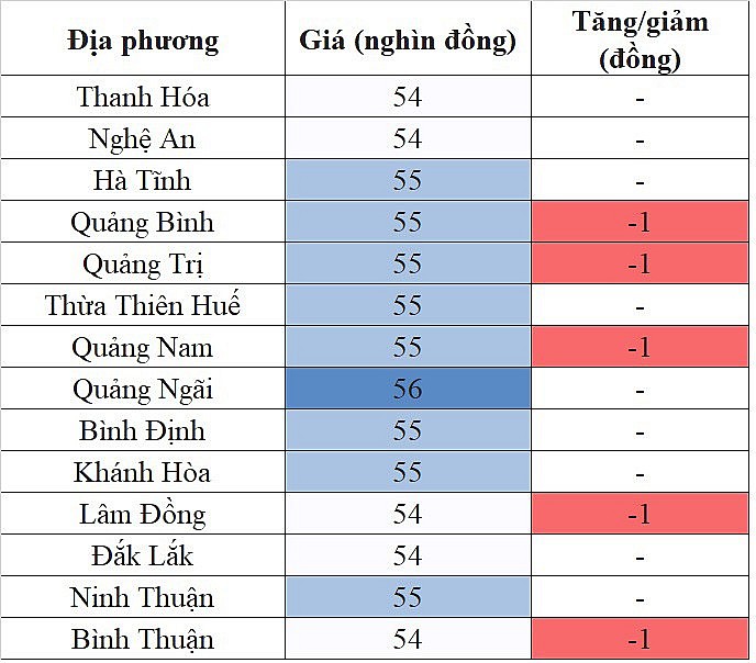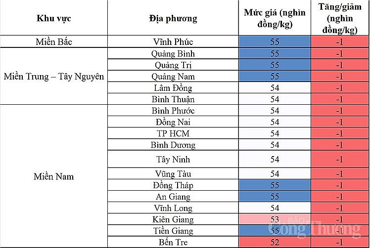 Các địa phương khác không ghi nhận sự biến động mới về giá, trong đó, mức giá cao nhất khu vực 56.000 đồng/kg được ghi nhận tại Quảng Ngãi. Các địa phương còn lại trong khu vực ghi nhận mức giá 55.000 đồng/kg.