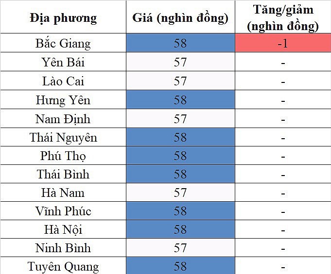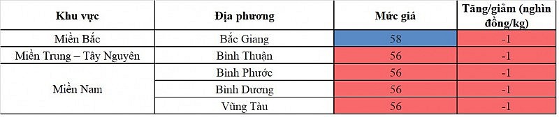 Các địa phương khác không ghi nhận sự biến động mới về giá, trong đó, mức giá 58.000 đồng/kg cũng được ghi nhận tại Hưng Yên, Thái Nguyên, Phú Thọ, Thái Bình, Vĩnh Phúc, Hà Nội, Tuyên Quang.