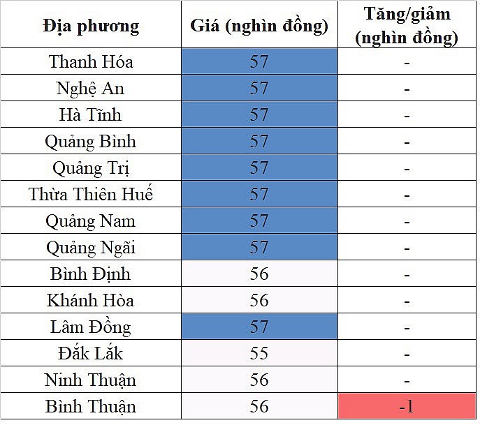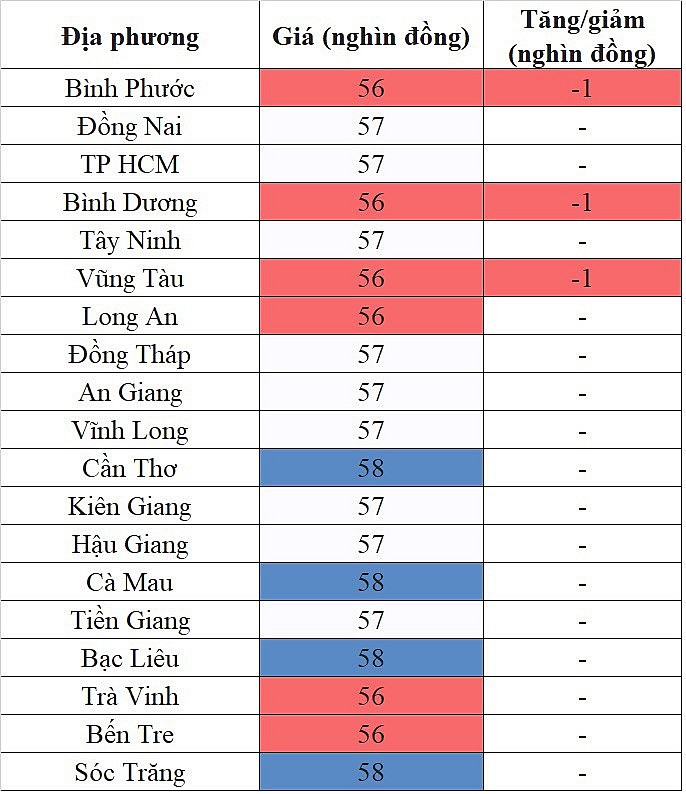 Các địa phương khác không ghi nhận sự biến động về giá, trong đó, mức giá cao nhất khu vực 58.000 đồng/kg được ghi nhận tại Cần Thơ, Cà Mau, Bạc Liêu, Sóc Trăng.