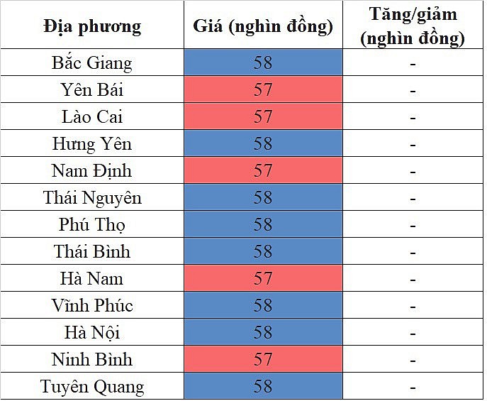 Ở chiều ngược lại, mức giá cao nhất khu vực 58.000 đồng/kg được ghi nhận tại Bắc Giang, Hưng Yên, Thái Nguyên, Phú Thọ, Thái Bình, Vĩnh Phúc, Hà Nội, Tuyên Quang.