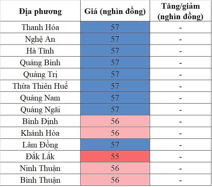 Ở chiều ngược lại, mức giá cao nhất khu vực 57.000 đồng/kg được ghi nhận tại Thanh Hóa, Nghệ An, Hà Tĩnh, Quảng Bình, Quảng Trị, Thừa Thiên Huế, Quảng Nam, Quảng Ngãi, Lâm Đồng.