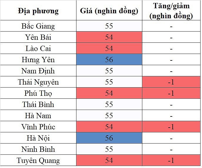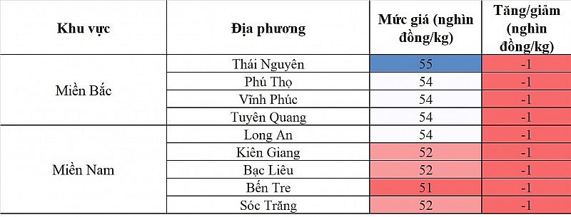 Các địa phương khác trong khu vực không ghi nhận sự biến động mới về giá, trong đó, mức giá cao nhất khu vực 56.000 đồng/kg được ghi nhận tại Hưng Yên, Hà Nội.