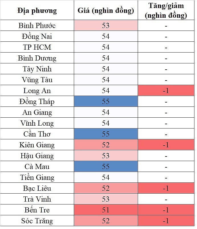 Các địa phương khác không ghi nhận sự biến động mới về giá, trong đó, mức giá cao nhất khu vực 55.000 đồng/kg được ghi nhận tại Đồng Tháp, Cần Thơ, Cà Mau.